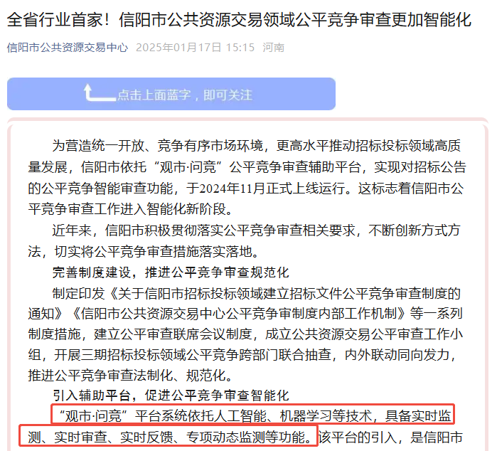 河南信阳市公共资源交易平台于2024年11月正式引入人工智能、机器学习等技术,其公平竞争审查工作率先进入智能化阶段!