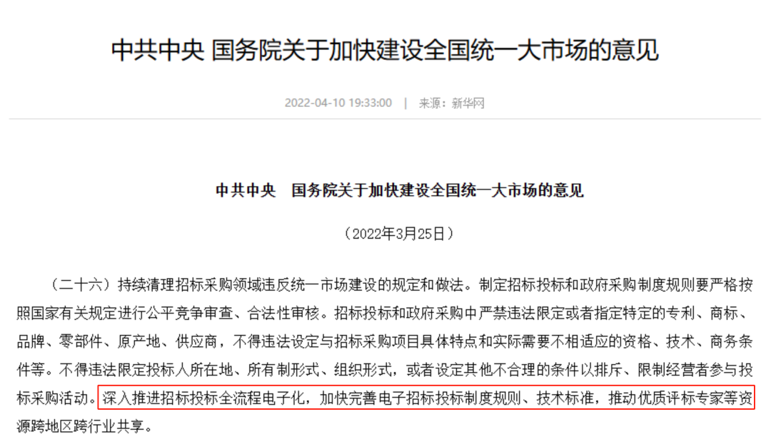 国务院关于《加快建设全国统一大市场的意见》提出“破除招投标领域隐性壁垒”,要求通过技术手段减少人为干预。