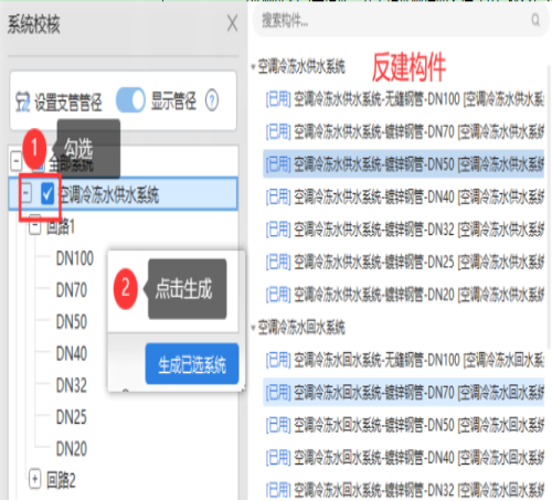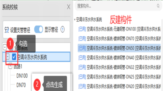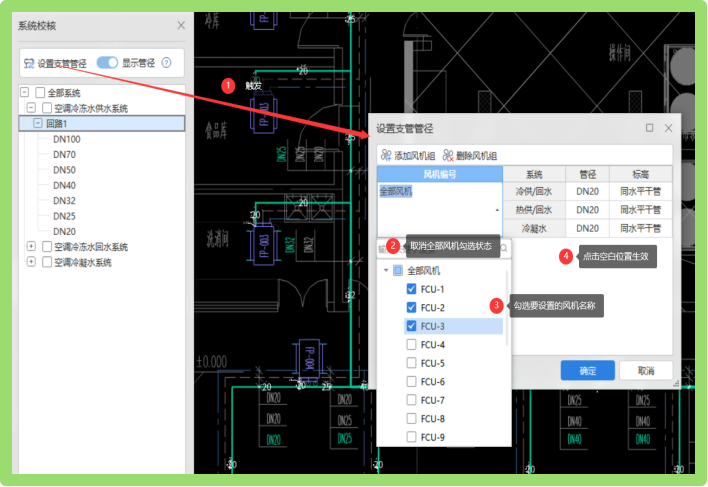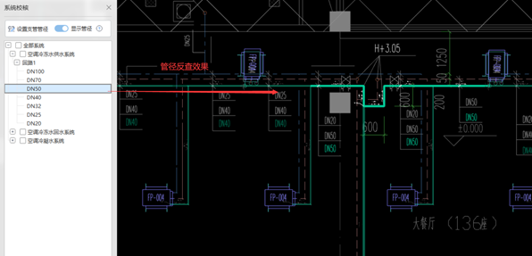 系统校核窗体中,系统、回路、管径节点均支持单击反查,可定位到绘图区所在位置,清晰直观。