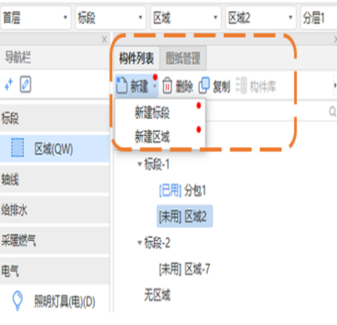 新建标段/区域:区域绘制方式灵活多样能满足各类形状的区域。标段区域关系层级清晰呈现,对于施工方,施工过程中便于管理提量进度。