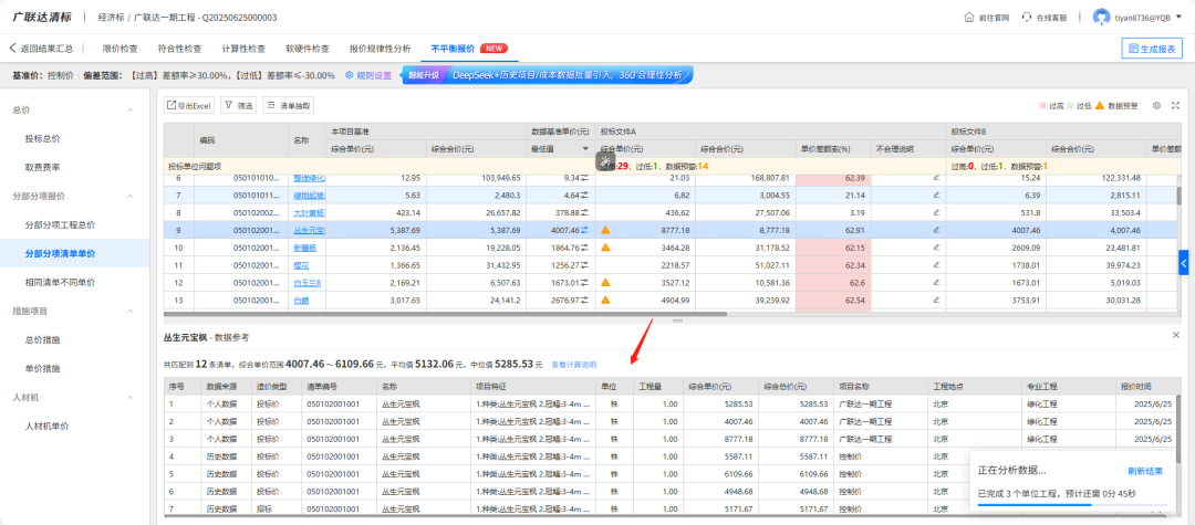 在原有不平衡报价的基础上,通过一键引入新数据辅助报价分析,利用deepseek精准匹配相同清单,360°高效分析,全面识别报价合理性风险!