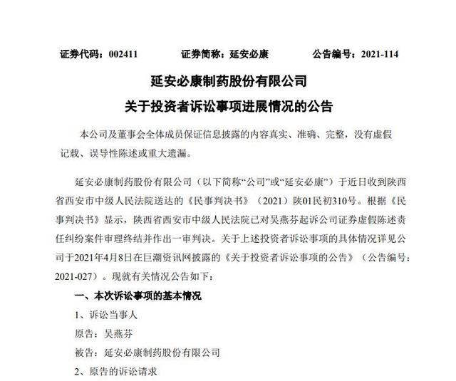 据股民索赔平台股票索赔123网消息,2021年10月11日晚间,延安必康发布《关于投资者诉讼事项进展情况的公告》,公告显示西安中院已经对延安必康索赔案件一审下达了判决书:投资者获得胜诉,延安必康需要承担部分投资者亏损的赔偿责任。