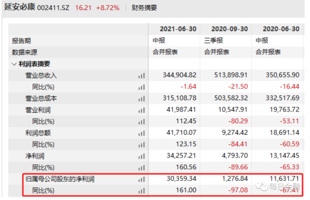 据公司的半年报和三季度报。曾经主营医药的延安必康2021年上半年净利润同比增长161%,但仅在三季度,其净利润同比增长数值突然飙高至4599%。其中固然有延安必康2020年三季报净利润低基数(0.13亿)的影响,但从绝对数值来看,三季度其预告净利润中值达到5.75亿元,几乎为上半年归母净利润的两倍。