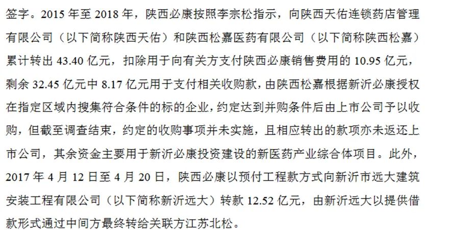 延安必康按照李宗松指示向陕西天佑、陕西松嘉两家公司累计转出43.40亿元,部分资金用于支付陕西天佑公司销售款项,部分资金用于支付收购款,由陕西松嘉公司在指定区域内搜集符合条件的企业,约定达到并购条件后由上市公司予以收购,但约定的收购事项并未实施,且相应转出的款项亦未返还上市公司。