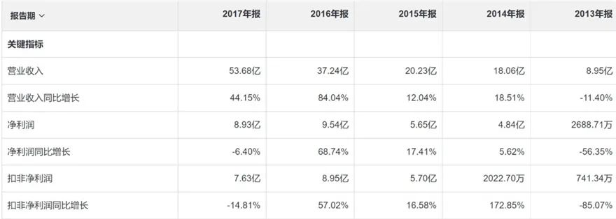 延安必康在2013年至2017年的发展可谓迅猛,营收翻了几倍,利润更是从两千多万冲到了将近9亿。