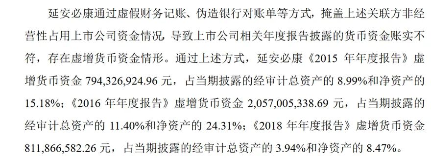 为了掩饰控股股东及实控人占用资金的情况,延安必康在2015-2018年通过虚假财务记账、伪造银行账单等方式,虚增货币资金超36亿元。