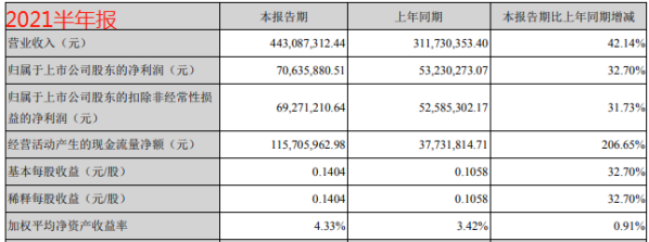 公开信息显示,汉森制药是集研发、生产、销售为一体的中成药生产企业,主营业务为传统中成药制剂、化学药、医用制剂。该公司目前尚未披露三季报,但从半年报来看,其业绩良好。2021年上半年,该公司实现营业收入4.43亿元,同比增长42.14%;实现净利润7063.59万元,同比增长32.7%。