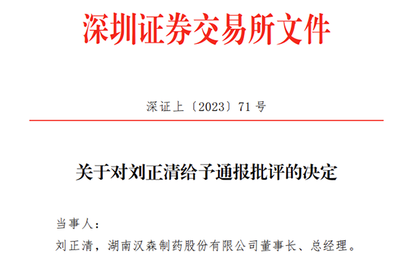 通报称,湖南汉森制药股份有限公司董事长、总经理刘正清的上述行为构成《证券法》第四十四条规定的短线交易,违反深交所《股票上市规则(2018年11月修订)》第3.1.9条的规定。