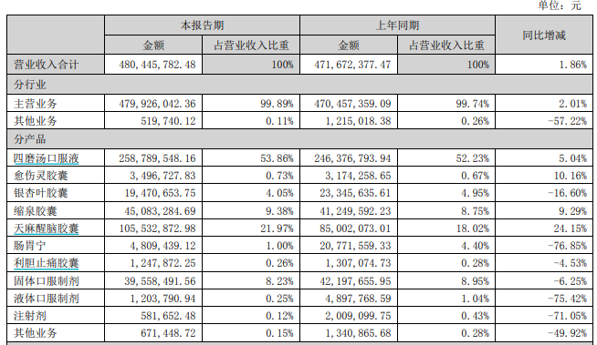 公司营收主要依靠大单品支撑。分产品来看,报告期内,四磨汤口服液贡献公司5成以上收入,该产品实现收入约2.59亿元,同比增长5.04%;除此之外,天麻醒脑胶囊实现收入约1.06亿元,同比增长24.15%,占营收的21.97%。