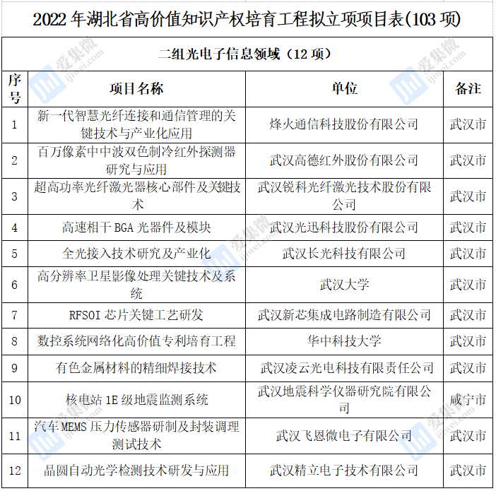 2022年湖北省高价值知识产权培育工程拟立项项目共103项,其中光电子信息领域12项,包括百万像素中中波双色制冷红外探测器研究与应用(武汉高德红外股份有限公司)、高速相干BGA光器件及模块(武汉光迅科技股份有限公司)、RFSOI芯片关键工艺研发(武汉新芯集成电路制造有限公司)、汽车MEMS压力传感器研制及封装调理测试技术(武汉飞恩微电子有限公司)、晶圆自动光学检测技术研发与应用(武汉精立电子技术有限公司)等。