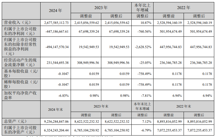 4月24日,高德红外(002414)发布2024年年报。报告显示,公司2024年营业收入为26.78亿元,同比增长10.87%;归母净利润为-4.47亿元,同比下降760.56%;扣非归母净利润为-4.94亿元,同比下降2628.52%;基本每股收益-0.10元。公司2024年度拟不派发现金红利、不进行资本公积金转增股本、不送红股。