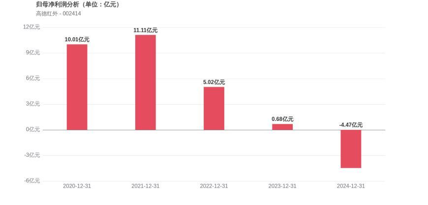 利润角度分析,2020年高德红外实现归母净利润10.01亿元,2024年-4.47亿元。公司盈利状况从高点快速下滑至亏损状态。