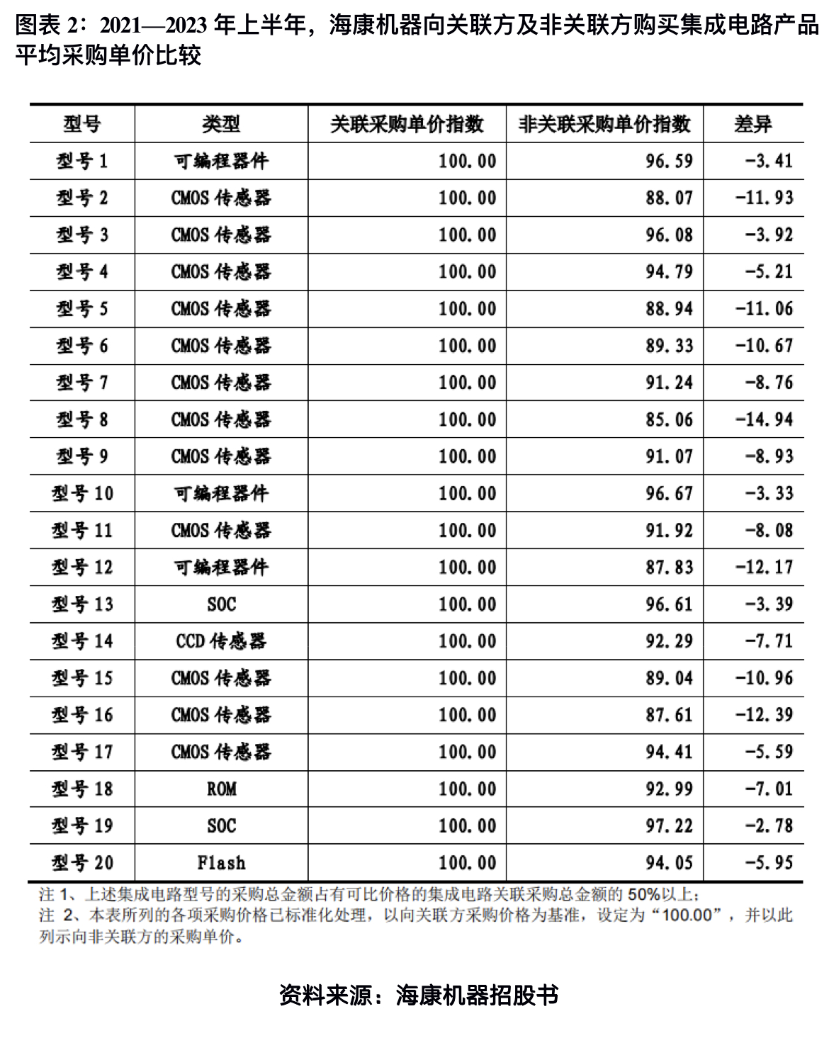 招股书中的平均采购单价比较结果显示,2021—2023年上半年,海康机器关联采购单价指数均高于非关联采购单价指数,同等型号中,关联采购单价指数最高要比非关联方指数高出14.94%,10个型号的集成电路产品采购单价指数平均高出8.34%。
