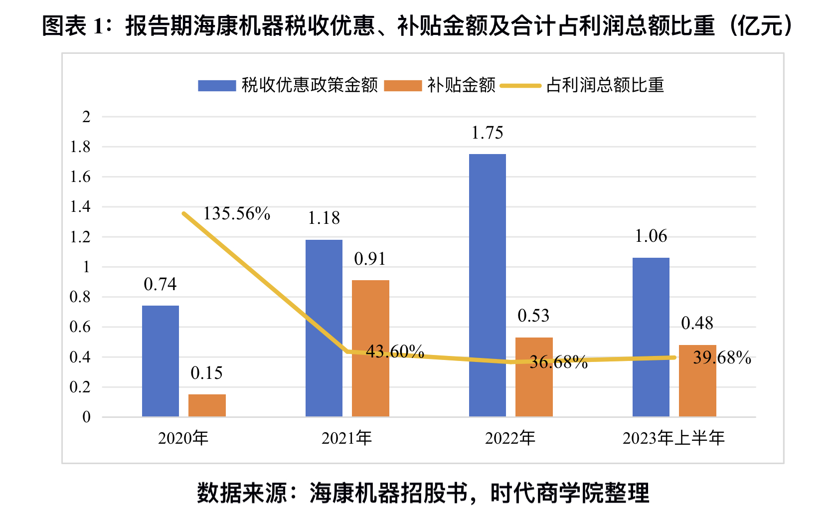 但业绩增长背后,海康机器的盈利仍较为依赖补贴及税收优惠。报告期内,海康机器的税收优惠金额分别为0.74亿元、1.18亿元、1.75亿元、1.06亿元,补贴金额分别为1498.41万元、9091.21万元、5288.88万元、4751.25万元,补贴及税收优惠合计占利润总额的比重分别为135.56%、43.6%、36.68%、39.68%,2023年上半年占比仍接近四成。