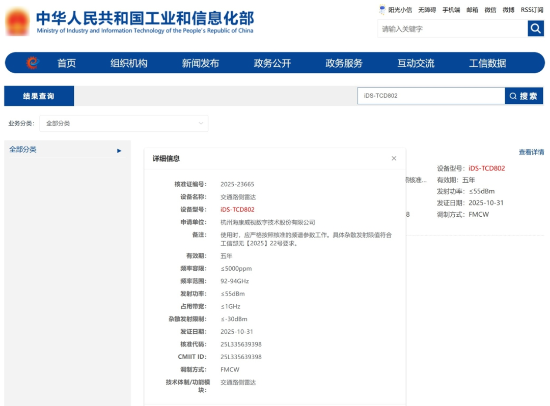 凭借十余年毫米波雷达领域全链路自研经验, 海康威视 率先推出通过工信部型号核准认证的92-94GHz路侧毫米波雷达&雷视新品,为智能交通感知增添新助力。