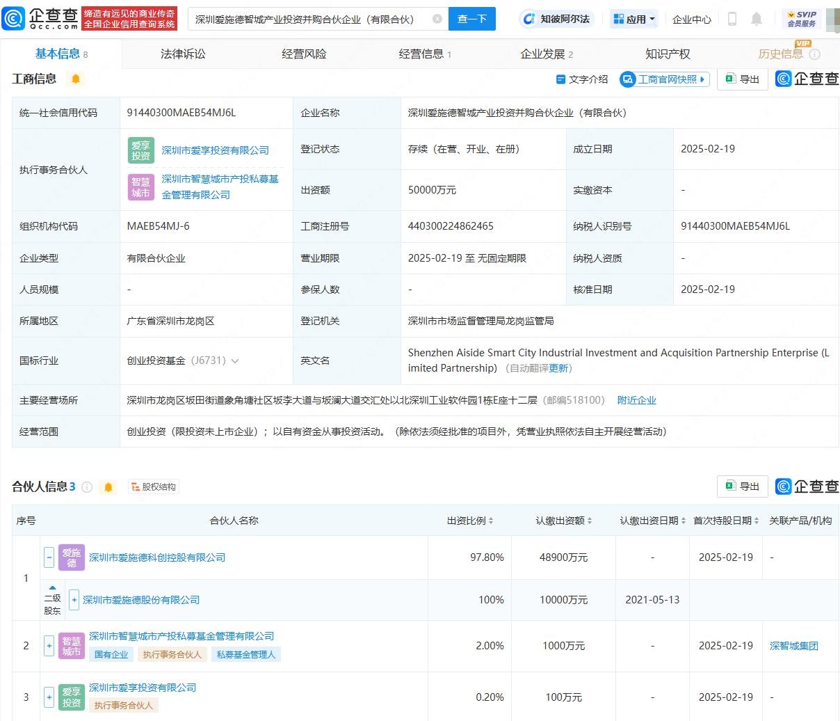 近日,深圳爱施德智城产业投资并购合伙企业(有限合伙)成立,出资额5亿元,经营范围包含:创业投资(限投资未上市企业);以自有资金从事投资活动。该合伙企业由爱施德(002416)旗下深圳市爱施德科创控股有限公司、深圳市智慧城市产投私募基金管理有限公司等共同持股。