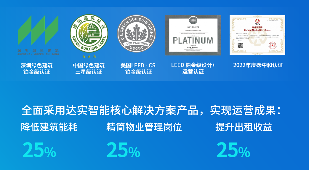 本次活动地点达实智能大厦——是达实智能自主投资建设的总部大楼,投资11亿,大厦全面应用自主研发的 AIoT 智能物联网管控平台、空间应用系统及产品,链接大厦内20000多个设备,服务了将近5000多个手机终端,实现了降低建筑能耗25%、精简物业管理岗位25%、提升出租收益25%,荣获国际 LEED 绿色建筑顶级的铂金级设计和运营认证,是深圳首栋碳中和超高层建筑,也是 2023 年第 28 届联合国气候变化大会十佳交流案例之一。