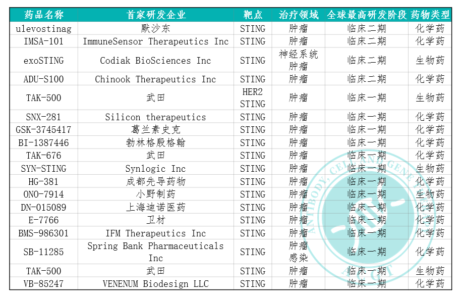 目前暂无该靶点药物获批上市。通过查询药融云数据库,可知除KL340399注射液之外,全球有18款靶向STING的药物进入临床研发阶段,其中进展最快的是默沙东开发的MK-1454(ulevostinag),已进入临床II期。