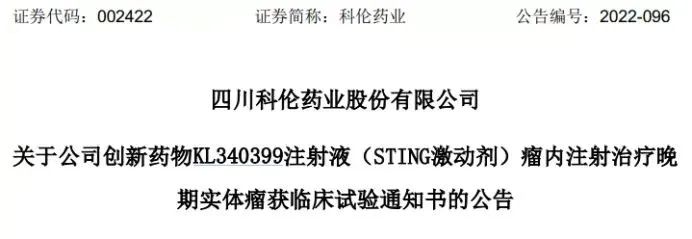 近日,四川科伦药业股份有限公司宣布,其控股子公司四川科伦博泰生物医药股份有限公司开发的新一代小分子STING激动剂(KL340399注射液)获得了国家药品监督管理局(NMPA)签发的临床试验通知书。