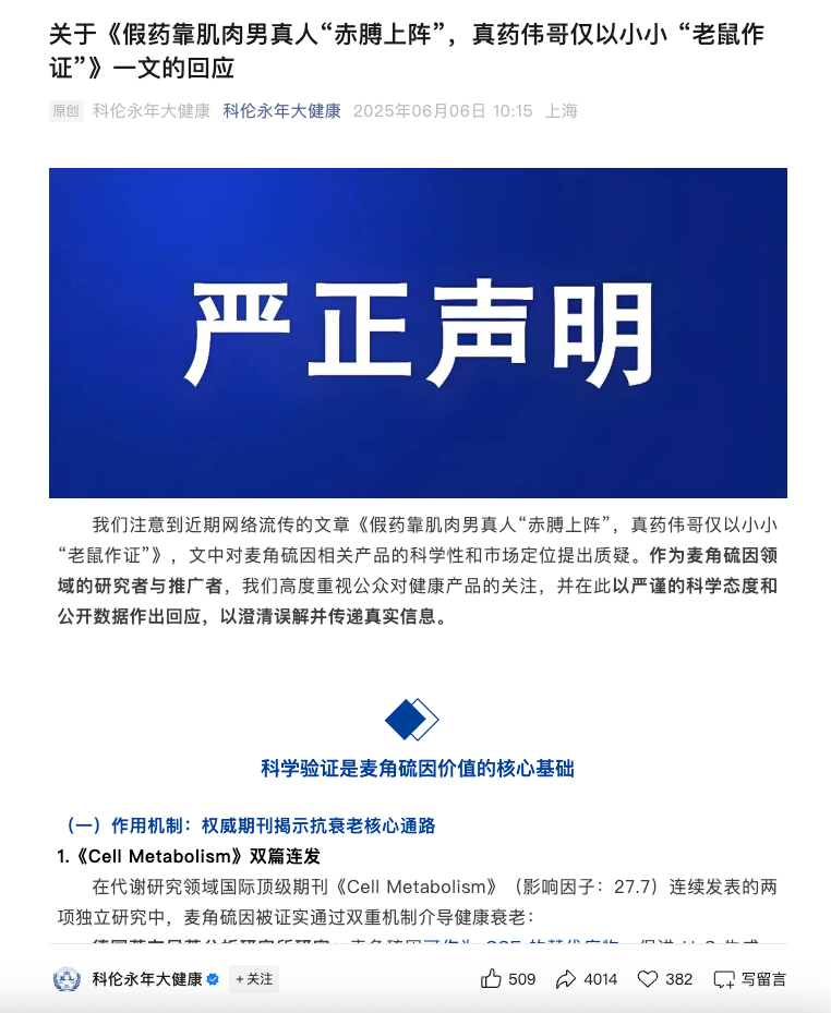 声明强调三点立场:公司从未将麦角硫因作为药物宣传,其定位是“功能性健康产品”;产品基于科学理论和品牌影响力,在海外有明确科研论文和临床论证支持;指责饶毅文章存在“偷换概念”问题。