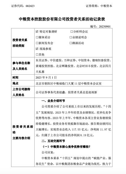 中粮资本向投资者简要介绍了公司重组上市以来的发展历程、“十四五”发展规划、2023年上半年经营及业绩情况、差异化竞争优势等内容。2023年上半年,中粮资本各项主营业务继续保持稳健增长,投资业务有效抵御市场波动,报告期业绩同比大幅增长,实现营业总收入117.55亿元,净利润11.97亿元,归属于上市公司股东的净利润8.19亿元。