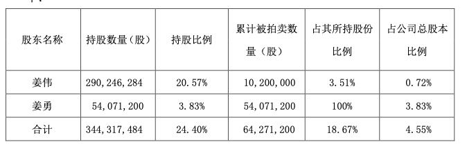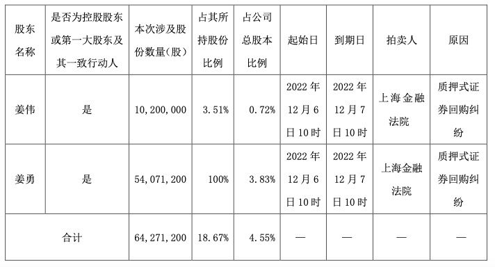 本次司法拍卖涉及的股份为64,271,200股,占公司总股本的4.55%。若姜伟先生及姜勇先生本次涉及的股份被拍卖后,姜伟先生将持有公司股份280,046,284股,占公司总股本的19.84%,姜勇先生将不再持有公司股份。本次司法拍卖不会导致公司实际控制权发生变更。