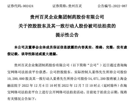 11月14日,贵州百灵企业集团制药股份有限公司(以下简称“贵州百灵”或“公司”)发布关于控股股东及其一致行动人股份被司法拍卖的提示性公告。公告称,公司控股股东、实际控制人姜伟所持公司股份10,200,000股及其一致行动人姜勇所持公司股份54,071,200股将被上海金融法院于2022年12月6日10时至2022年12月7日10时止在淘宝网络司法拍卖平台上进行公开网络司法拍卖。