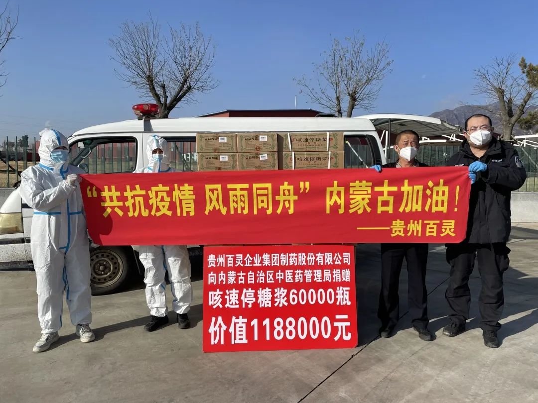 当前,内蒙古地区疫情防控形势严峻复杂。为全力支持内蒙古疫情防控工作,充分发挥中医药在疫情防控中的独特优势,贵州百灵企业集团积极调配、千里驰援,向内蒙古自治区累计捐赠“咳速停糖浆”1600件(96000瓶,价值1900800元)。内蒙古自治区中医药管理局在感谢信中表示,患者服用咳速停糖浆后相关症状得到明显改善,突显了中医药对新冠肺炎的独特作用和显著疗效,受到了广大医务人员和患者的好评,对内蒙古自治区疫情防控工作给予了极大的支持。