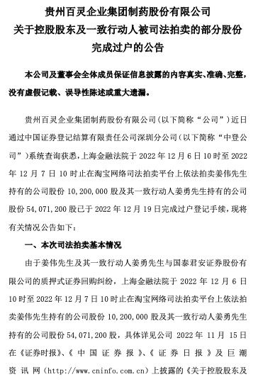 贵州百灵企业集团制药股份有限公司(以下简称“贵州百灵”或“公司”)12月20日发布关于控股股东及一致行动人被司法拍卖的部分股份完成过户的公告。公告称,上海金融法院于2022年12月6日10时至2022年12月7日10时止在淘宝网络司法拍卖平台上依法拍卖公司控股股东姜伟持有的公司股份10,200,000股及其一致行动人姜勇持有的公司股份54,071,200股已于2022年12月19日完成过户登记手续。