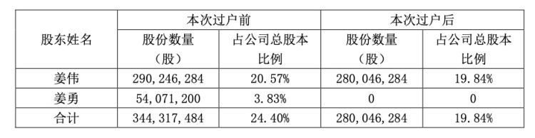 公告表示,截止本公告披露日,姜伟先生持有公司股份280,046,284股,占公司总股本的19.84%,累计质押股份218,649,978股,占公司总股本的15.49%,姜勇先生将不再持有公司股份。本次股份过户不会导致公司控制权发生变更,不会对公司的生产经营产生重大影响。