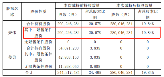 据悉,公开拍卖结束后,姜氏兄弟合计持有股占比将由24.40%降为19.84%。其中,姜勇将不再持有股份,由此实控人由姜伟、姜勇变更为姜伟。