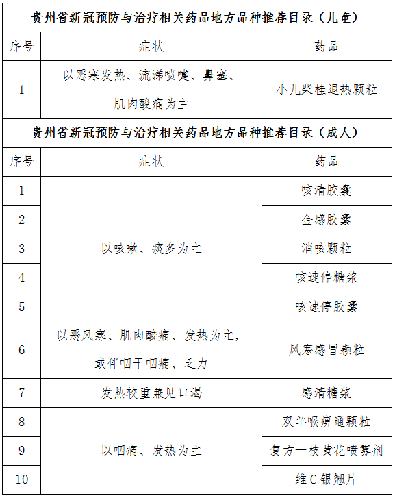 据悉,该目录由贵州省工业和信息化厅、贵州省卫生健康委员会、贵州省医疗保障局、贵州省中医药管理局、贵州省药品监督管理局五部门共同发布。根据目前新冠病毒感染后症状特点、患者体质状态、药品品规,结合全省重点医药企业供应保障实际情况,按照中西药分开的原则,针对发热、咳嗽咳痰、咽痛、胸闷胸痛等症状推荐4个西药品种、66个中成药品种。