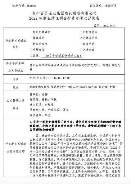 贵州百灵企业集团制药股份有限公司(以下简称“贵州百灵”或“公司”)5月16日发布公告称,公司于5月15日举行了2022年度业绩说明会。在会议中,贵州百灵透露,2022年年报利润1.38亿元,比业绩预告下限1.7亿元要低,是因为年报利润低于业绩预告主要是公司对信用减值损失、存货跌价损失预计不足。