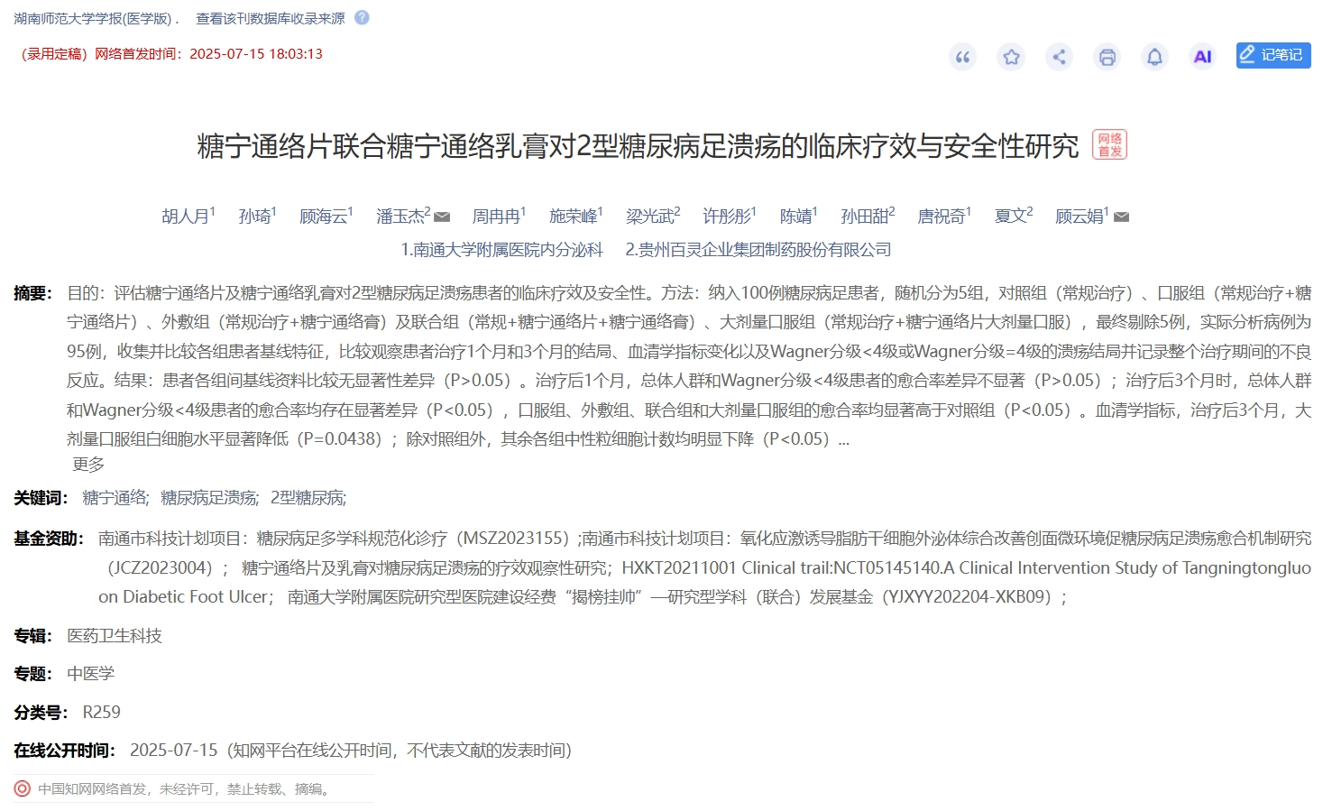 7月15日,由贵州百灵企业集团申办、南通大学附属医院顾云娟教授担任主要研究者的“糖宁通络片联合糖宁通络乳膏对2型糖尿病足溃疡的临床疗效与安全性研究”成果论文,在中国科技核心期刊《湖南师范大学学报(医学版)》正式发表。