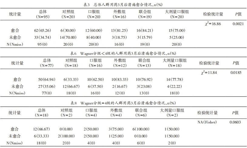 研究结果显示,总体人群不同分组在3月后的愈合率存在显著差异(p=0.0021)。常规治疗对照组的愈合率最低为30%。外敷组、联合组、大剂量口服组的愈合率分别为81.25%、84.21%、75.00%,均高于对照组,与对照组差异显著(p 0.05)。具体来看,Wagner分级<4级的人群不同分组在3月后的愈合率存在显著差异(p=0.0185)。对照组的愈合率为33.33%。外敷组、联合组、大剂量口服组的愈合率分别为83.33%、76.92%、77.78%,均高于对照组,与对照组差异显著(p 0.05)。Wagner分级4级的人群不同分组在3月后的愈合率存在显著差异(p=0.0603)。对照组无病例愈合。口服组、外敷组、大剂量口服组的愈合率分别为50.00%、75.00%、50.00%,虽高于对照组,但受病例数影响与对照组差异不显著(p 0.05)。但口服+外敷联合组的愈合率为100%,与对照组差异显著(p=0.0357)。