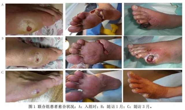 本次研究为一项随机对照试验,纳入南通大学附属医院内分泌代谢科Wagner分级2-4级的2型糖尿病足溃疡患者共100例(完成病例95例)。在常规治疗的基础上,随机分为对照组(常规治疗组)、口服组(糖宁通络片)、外敷组(糖宁通络乳膏)、联合组(糖宁通络片+糖宁通络乳膏)、大剂量口服组(糖宁通络片),开展为期3个月的治疗,其中在治疗1个月和3个月时各评估一次疗效。