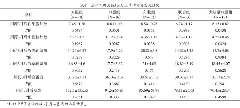 此外,治疗3个月后,大剂量口服组的白细胞水平显著下降(p=0.0438),其他组别未发现显著差异(p 0.05),各组数据均在正常参考范围内。中性粒细胞计数方面,除对照组外,其余干预组较治疗前均显著下降(p 0.05),亦未超出正常范围,提示可能具有一定的抗炎作用。同时,对于谷丙转氨酶、谷草转氨酶、白蛋白及肌酐的水平,治疗前后未观察到显著变化(p 0.05),说明药物安全性良好。