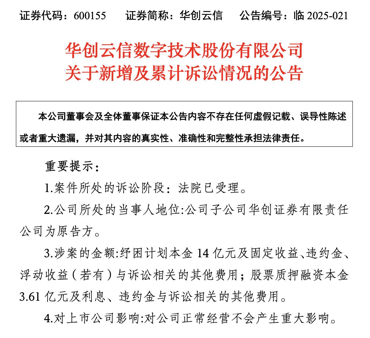 在纠纷的积累下,2025年矛盾终于爆发。8月14日晚, 华创云信 公告称,全资子公司 华创证券 已分别向 贵阳市中级人民法院 、 云岩区人民法院 提起诉讼,要求 贵州百灵 实控人姜伟及一致行动人姜勇、张锦芬等,履行纾困计划和股票质押借款相关义务,涉案金额约17.61亿元,包括纾困计划本金14亿元、股票质押融资本金3.61亿元。