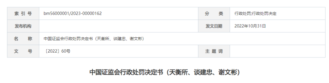 中国证监会行政处罚决定书(天衡所、谈建忠、谢文彬)