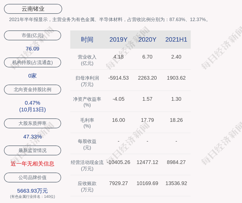 2021年半年报显示,云南锗业的主营业务为有色金属、半导体材料,占营收比例分别为:87.63%、12.37%。