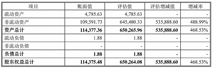 根据深圳市鹏信资产评估土地房地产估价有限公司出具的《资产评估报告》,截至评估基准日2021年8月31日,昆明丰泰资产总额账面价值11.44亿元,净资产账面价值11.44亿元,按资产基础法评估的昆明丰泰股东全部权益的评估值为65.03亿元,评估增值53.59亿元,增值率468.53%。