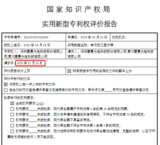 该专利诉讼提起时间不明,不过国知局网站显示,雷曼光电方面曾于2023年10月18日申请了该实用新型专利的评价报告,而国知局2023年12月4号下发的评价报告结果显示,该专利部分权利要求缺乏新颖性、创造性不符合授予专利权的相关条件。