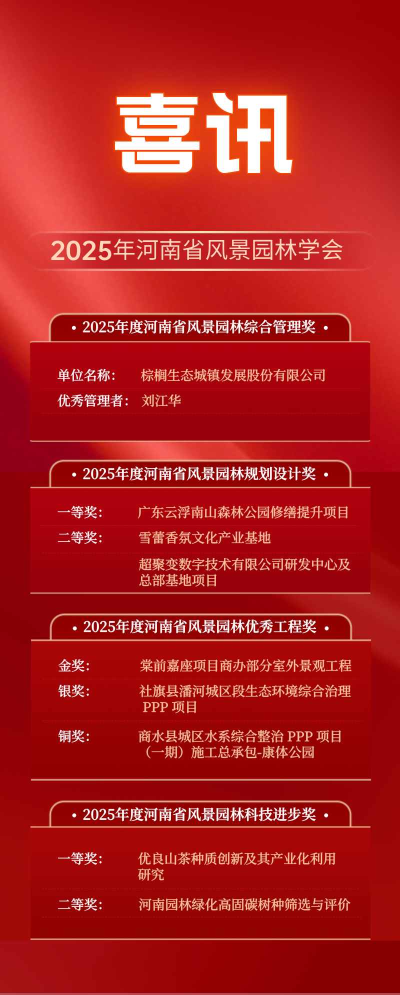 近日, 河南省风景园林 学会年度评奖结果公布, 棕榈股份 凭借优秀的项目管理能力、规划设计能力以及科研能力揽获8项荣誉, 棕榈股份 党总支书记、董事长刘江华荣获优秀管理者称号。
