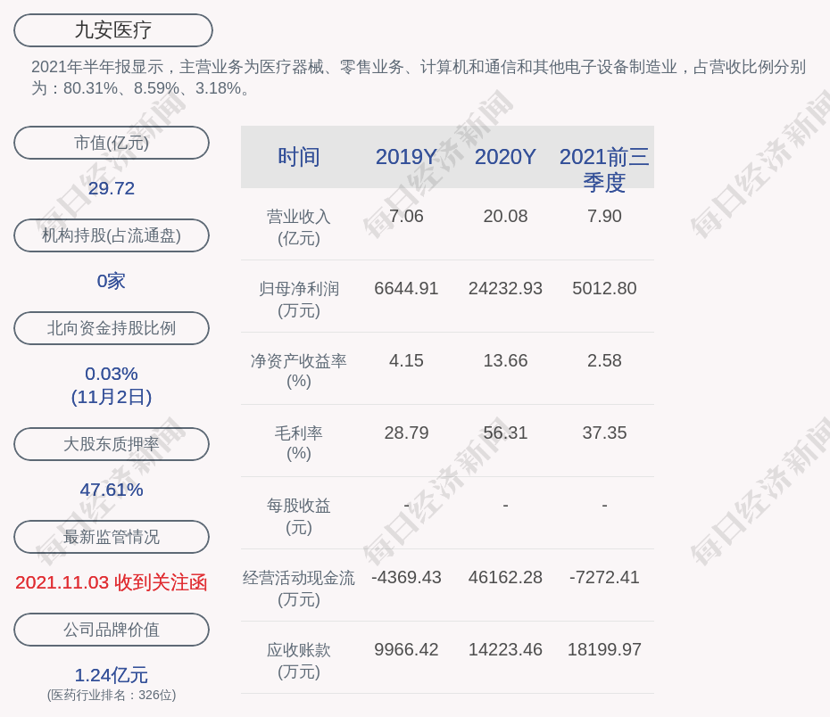 2021年半年报显示,九安医疗的主营业务为医疗器械、零售业务、计算机和通信和其他电子设备制造业,占营收比例分别为:80.31%、8.59%、3.18%。