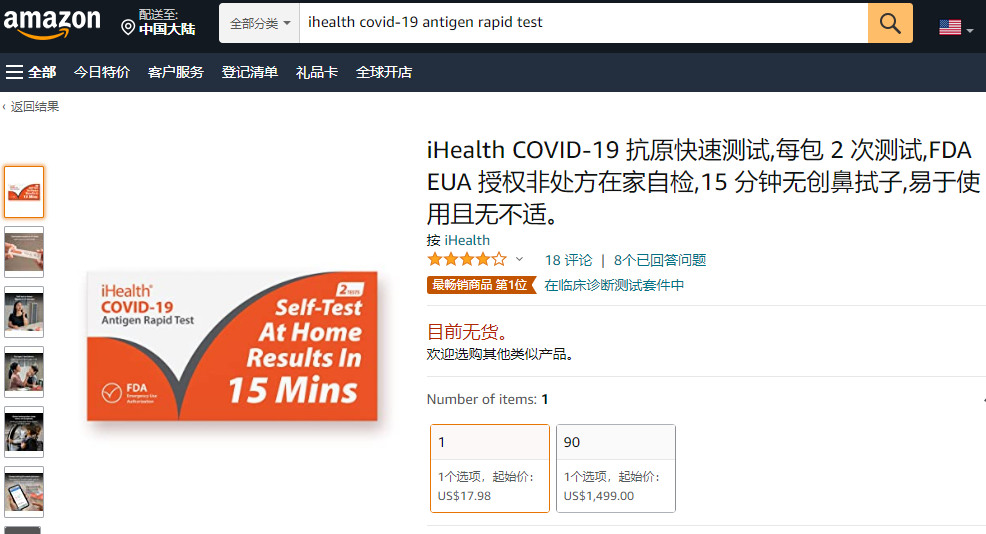 并且,之后其子公司检测试剂盒已经在美国在线购物网站亚马逊进行线上销售。官方网站零售价为6.99美元(一人份),而在亚马逊的零售价为一盒(2支装)售价为17.98美元。