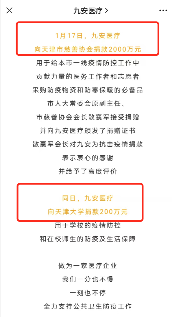 1月18日下午公司官微显示,九安医疗在1月17日向天津市慈善协会捐款2000万元,用于给天津市市一线疫情防控工作中贡献力量的医务工作者和志愿者采购防疫物资和防寒保暖的必备品;同日,九安医疗向天津大学捐款200万元,用于学校的疫情防控和在校师生的防疫及生活保障。