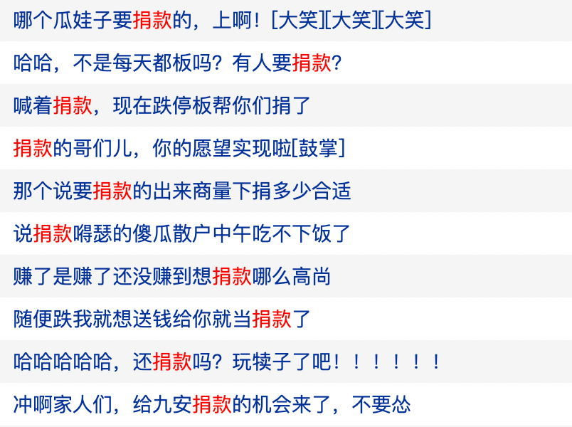 股价大跌后,不少网友调侃道“前面赚钱的想给公司捐钱,后进来的只能捐骨头渣了”,还有网友发出“还捐钱吗?”的灵魂考问。还有人表示,“小散捐款”恐怕会成为和“关灯吃面”一样的热梗。