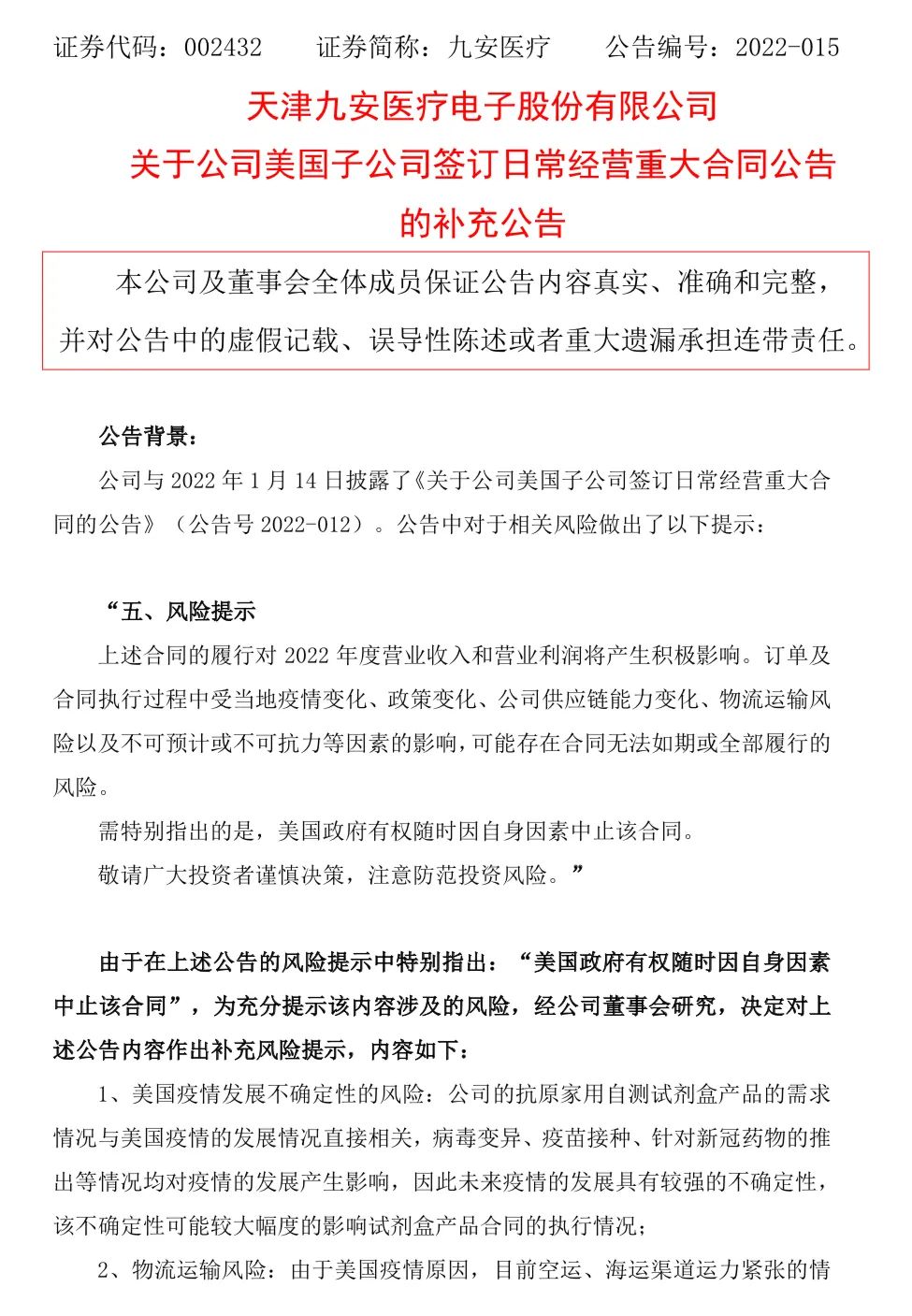 但很快,九安医疗就发布了补充公告称,“美国政府有权随时因自身因素中止该合同”。也就是说,这笔高额订单随时有可能被美方取消,且“不需要任何理由”。而订单取消后带来的全部损失,则将由九安医疗自己承担。
