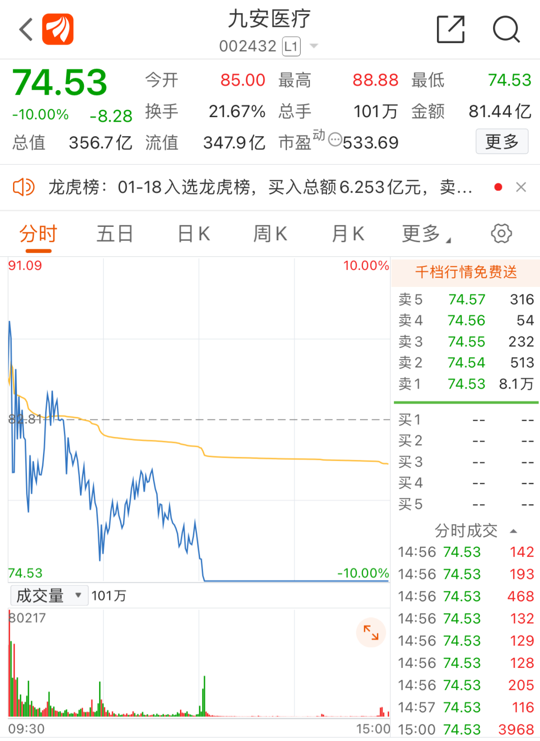 交易行情显示,1月18日早盘九安医疗高开2.64%,在股价短暂小幅冲高后震荡下挫。当日午后开盘,九安医疗快速跌停,截至当日收盘,九安医疗收74.53元/股,跌幅为10%。九安医疗1月18日盘中最高价为88.88元/股。据东方财富显示,1月18日九安医疗总共成交金额81.4亿元,总市值为356.7亿元。