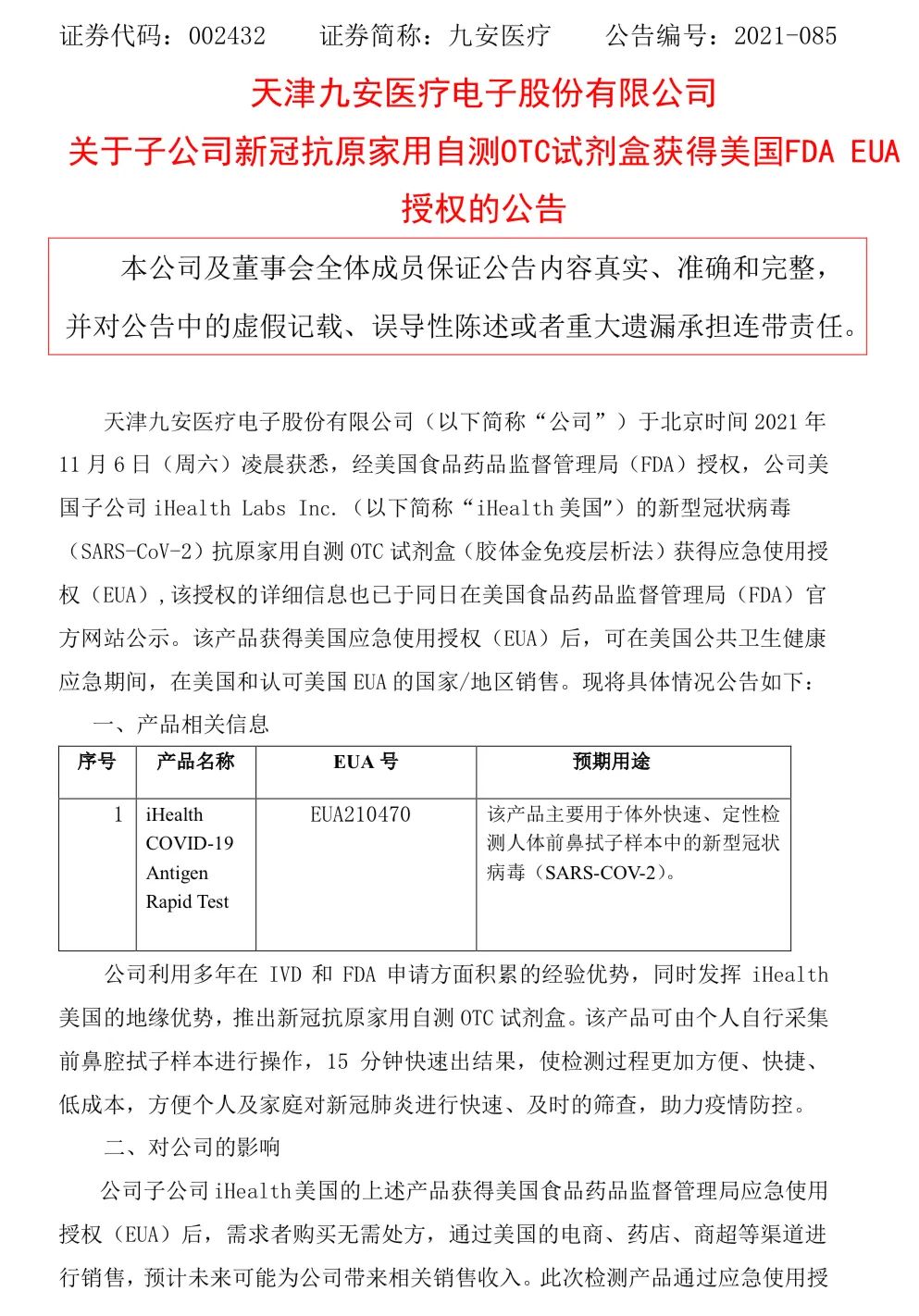 此前报道,九安医疗自2021年11月8日以来,股价开始上扬。其在11月8日发布公告称,公司于北京时间2021年11月6日凌晨获悉,经美国食品药品监督管理局授权,公司美国子公司iHealth的新冠自测试剂盒获得应急使用授权可在美国公共卫生健康应急期间,在美国和认可美国 EUA的国家/地区销售。